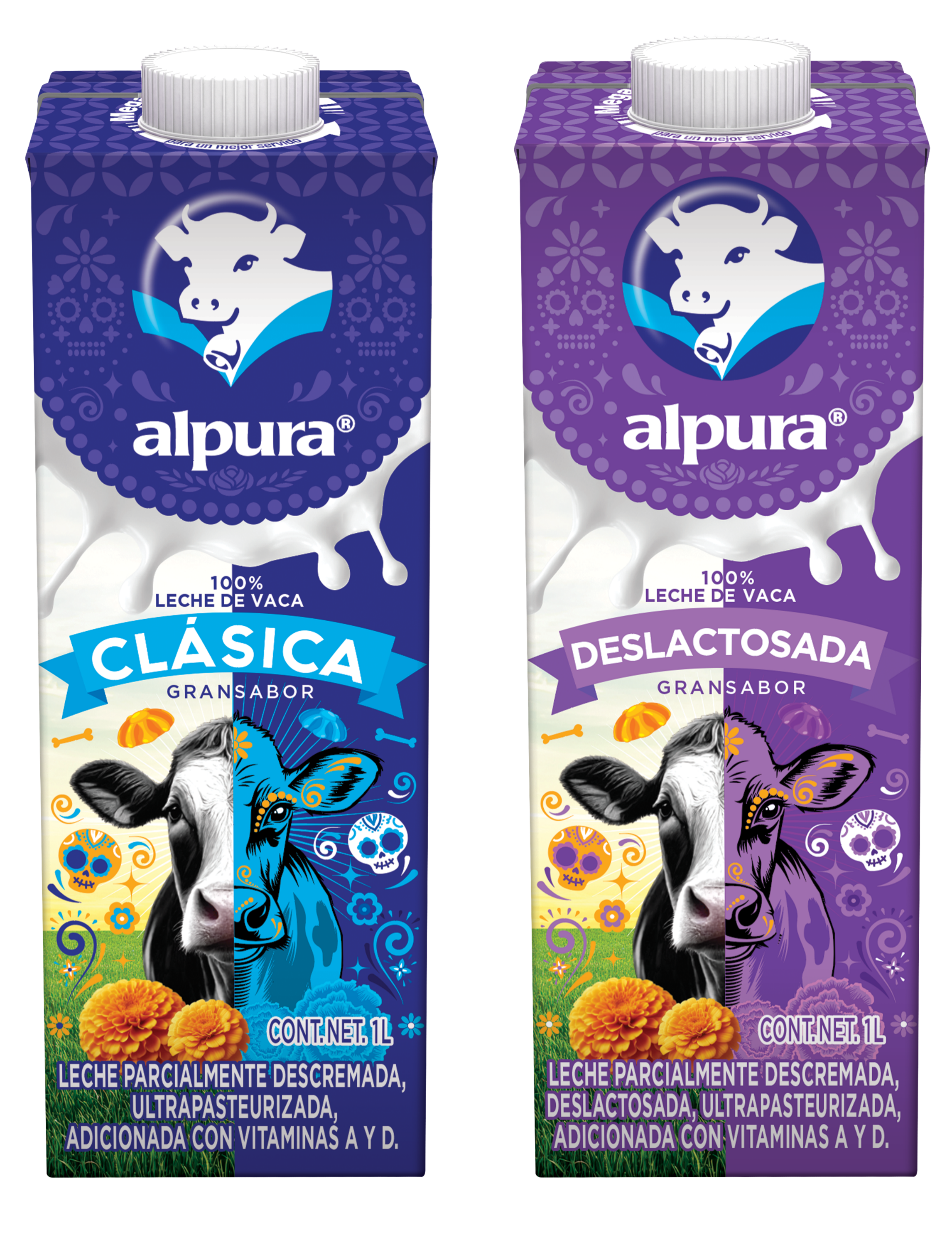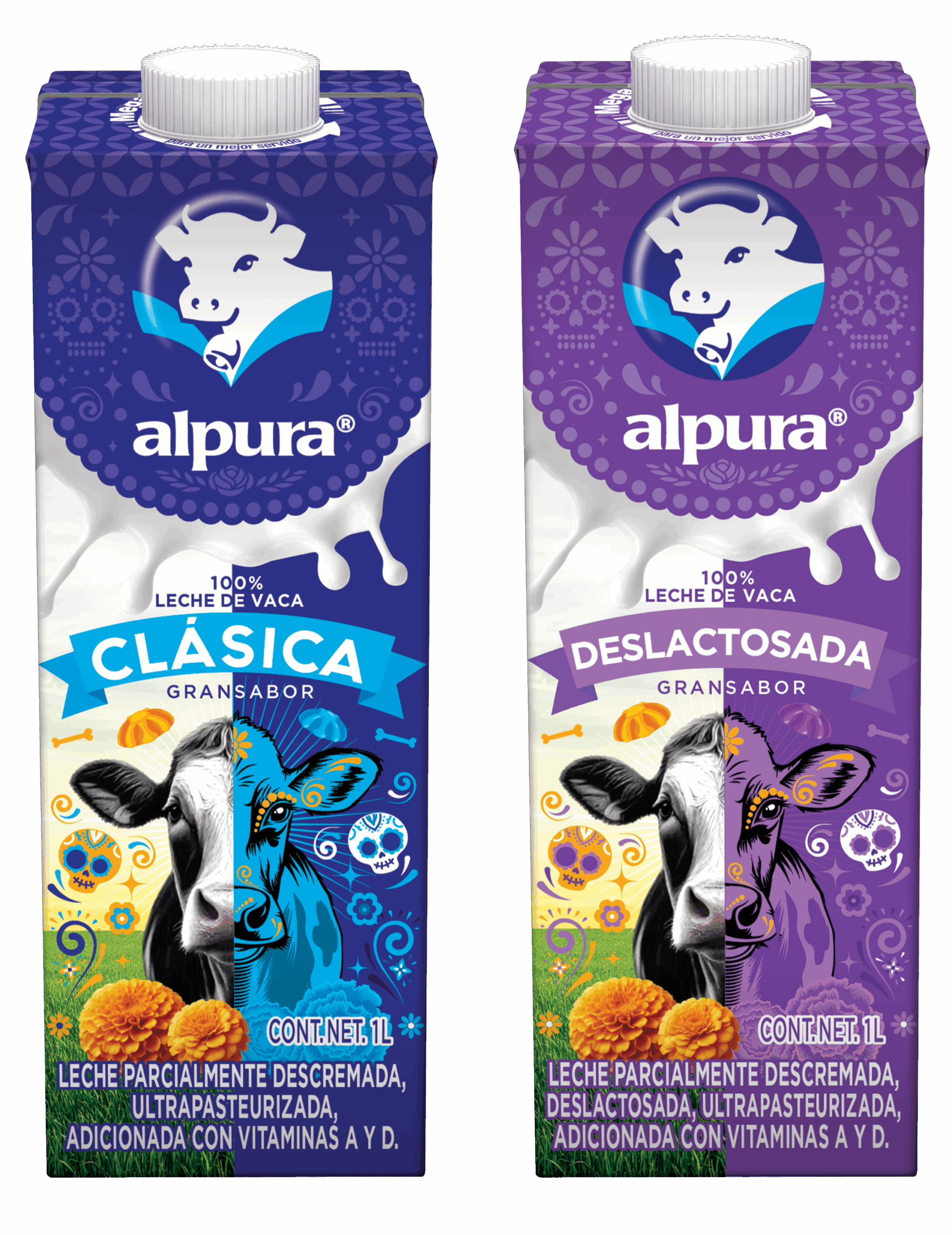 El envase representa la unión entre los mundos de los vivos y los muertos, con un lado cálido que evoca los ranchos donde se produce la leche y otro con tonos azules y símbolos tradicionales. En el centro, la vaca Alpura, adornada con flores, une ambos planos y se convierte en el puente entre lo tangible y lo trascendente.