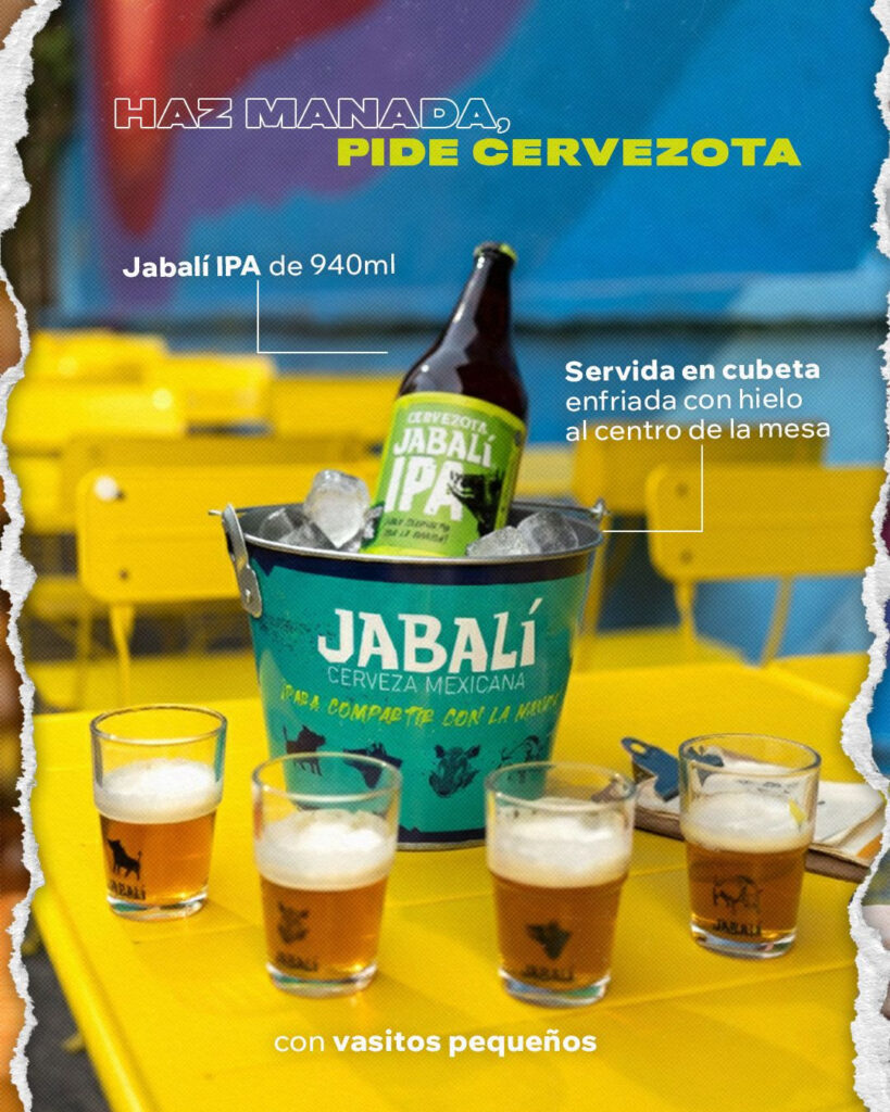Así nace la Cervezota: una botella de 950 ml de Jabalí IPA, servida en cubeta con hielo y compartida en vasitos tipo cañita. Una experiencia genuina, con carácter urbano y espíritu mexicano, que convierte el momento en ritual.