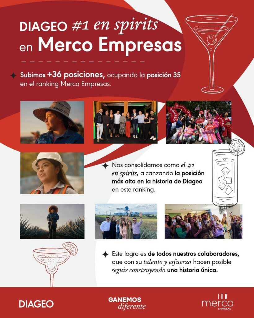 puesto 35 en el ranking Merco Empresas 2025, tras haber ocupado el lugar 71 en 2024. Este resultado representa la posición más alta alcanzada por la compañía en este monitor y la consolida como una de las más reconocidas por su reputación corporativa en el país, impulsada por su enfoque en innovación, sostenibilidad y responsabilidad social.Periodistas Unidos. Ciudad de México a 26 de octubre de 2025.- Diageo México escaló al