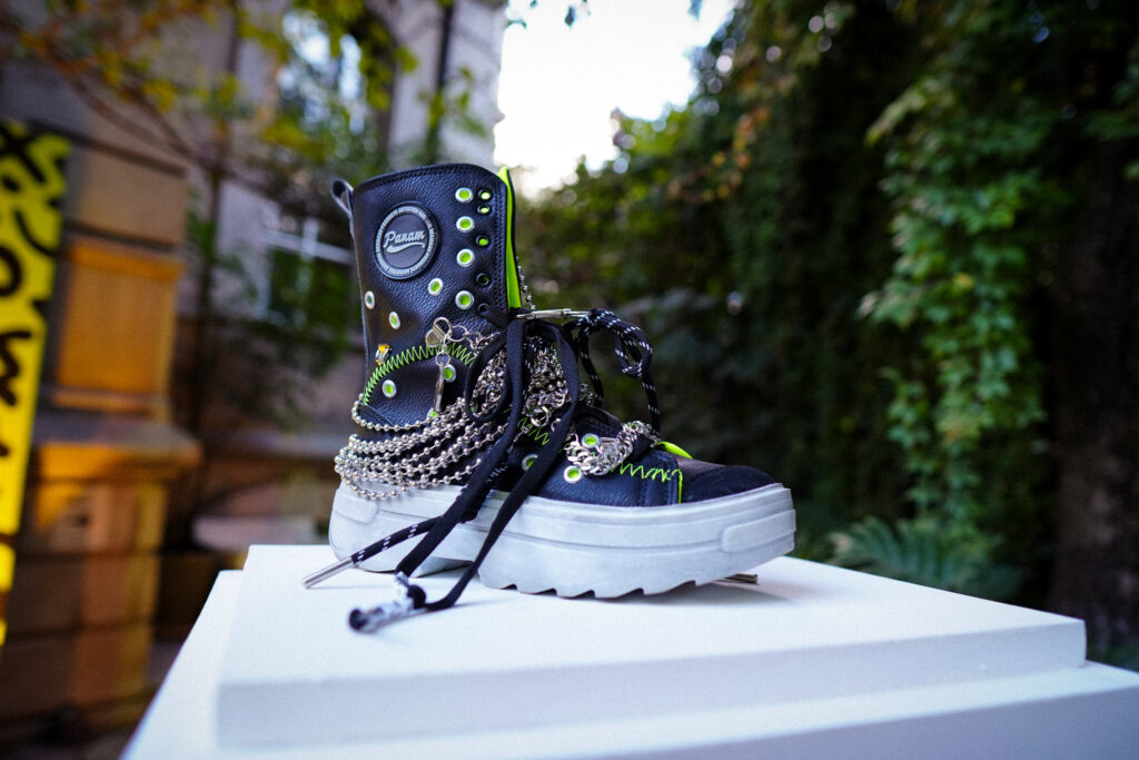 «Fuega», una llamativa bota-sneaker chunky.La colección es particularmente significativa, ya que marca el regreso de Panam a una colaboración con una experta en diseño: Sophia Altholz. El resultado de esta sinergia es