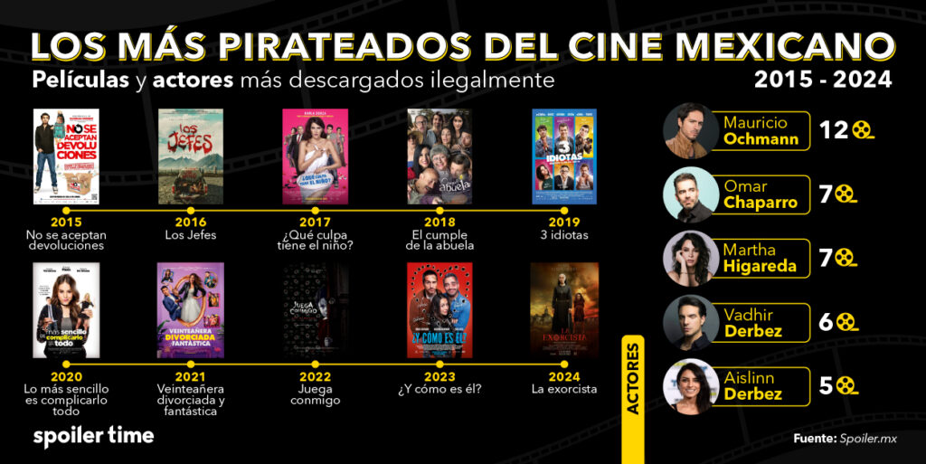 En México, durante el análisis de Spoiler , se encontraron datos de CANACINE que muestran tendencias interesantes. Igual que Interestelar, que un año después de su estreno seguía siendo muy buscada en sitios ilegales, No se Aceptan Devoluciones, ópera prima de Eugenio Derbez, fue la más pirateada de 2015. Y el legado familiar no se quedó ahí: Aislinn y Vadhir Derbez también figuran en el top de la década, con Vadhir destacando por aparecer dos veces entre las más pirateadas, gracias a Veinteañera, Divorciada y Fantástica y 3 Idiotas, donde compartió créditos con Martha Higareda.