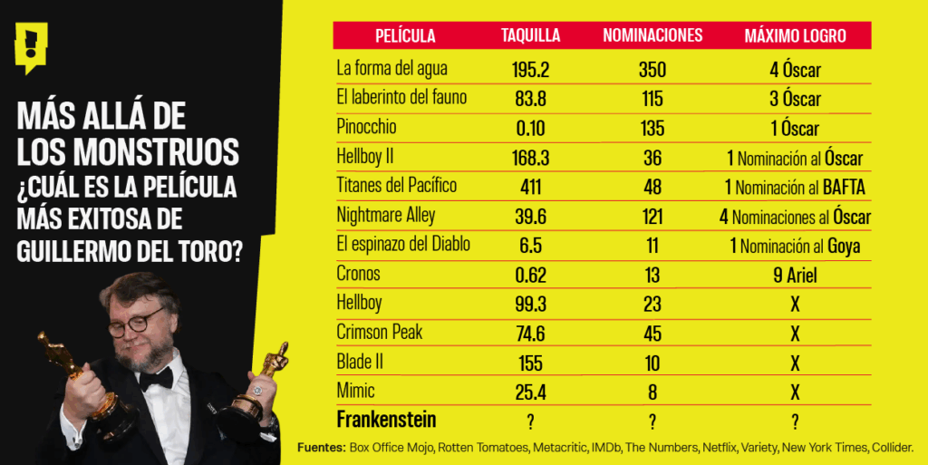 Con motivo del estreno de Frankenstein en Netflix, Spoiler realizó un análisis de sus 13 largometrajes, el cual permite responder una pregunta que trasciende el gusto personal: ¿Cuál es realmente su película más exitosa?