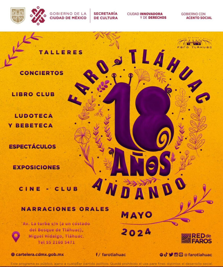 Periodistas Unidos. Ciudad de México. 09 de mayo de 2024.- La Fábrica de Artes y Oficios (Faro) Tláhuac, recinto perteneciente a la Secretaría de Cultura de la Ciudad de México, festeja su 18 aniversario con diversas actividades gratuitas el sábado 11, el martes 14, y el domingo 19 y 26 de mayo, como conciertos de ska, exposiciones, teatro infantil, la novena edición de su picnic gótico y un baile familiar que mezcla ritmos como salsa y son cubano.