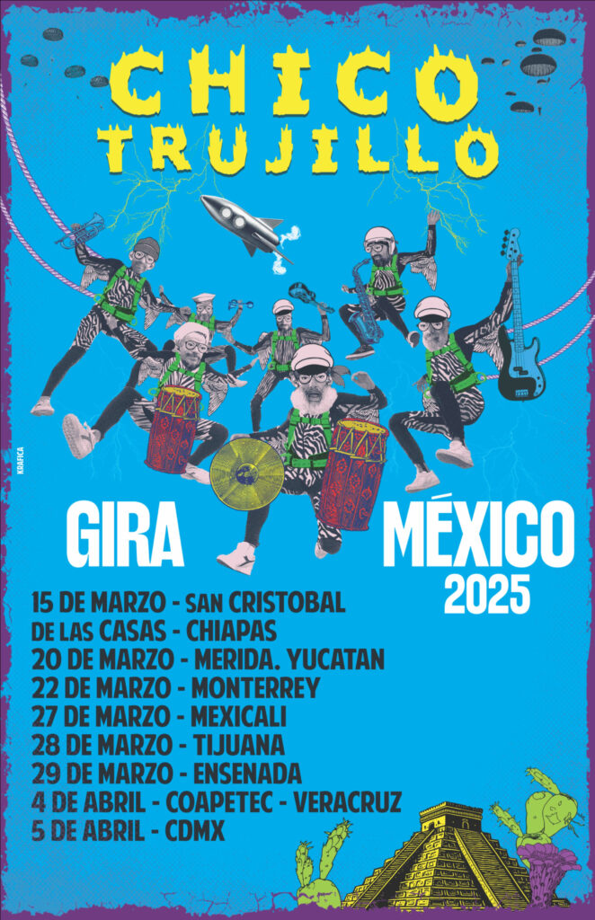 La gira de los 25 años de Chico Trujillo en MéxicoSalón Los Ángeles en la Ciudad de México el 5 de abril. comenzará en marzo y recorrerá varias ciudades del país. Después de arrancar en Chile el 1 de marzo, donde estarán celebrando su aniversario en Plaza La Paz de Recoleta, Chico Trujillo tomará el calor de la cumbia hasta México. Iniciando el 15 de marzo en el Jazz & Rhythms Festival en San Cristóbal de las Casas, Chiapas, la banda continuará su recorrido hacia Mérida, Monterrey, Mexicali, Tijuana, Ensenada y Veracruz. El broche de oro lo pondrán en el legendario