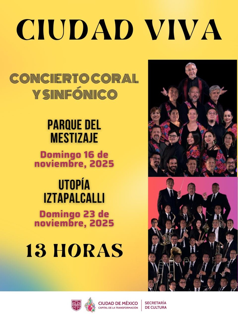 Periodistas Unidos. Ciudad de México. 11 de noviembre de 2025.- La Banda Sinfónica y el Coro de la Ciudad de México, integrantes del programa de Agrupaciones Musicales de la Secretaría de Cultura capitalina, presentarán “Ciudad Viva: Concierto Coral Sinfónico”, dos recitales gratuitos que fusionan música clásica, folclor mexicano y canciones populares.