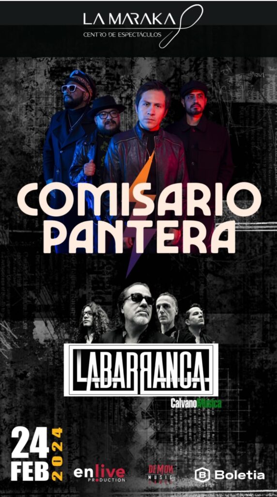 Para presentar a estas formaciones en una fecha única e imperdible se ha elegido el escenario del Centro de Espectáculos La Maraka el próximo Sábado 24 de Febrero de 2024 donde en punto de las nueve de la noche sonará lo mejor de cada una de las agrupaciones en un show de antología. Los boletos ya están a la venta en el Sistema Boletia y en taquillas del inmueble. Con este show, Comisario Pantera y La Barranca están listos para continuar adelante con sus respectivas giras llevando su característico sonido y energía a los escenarios.