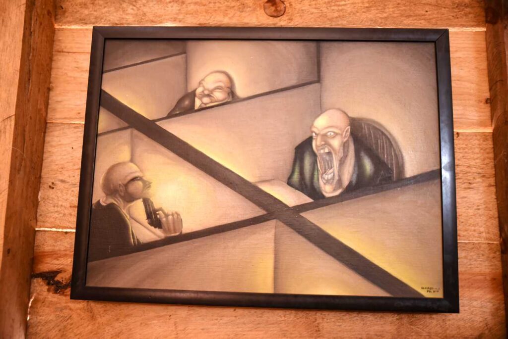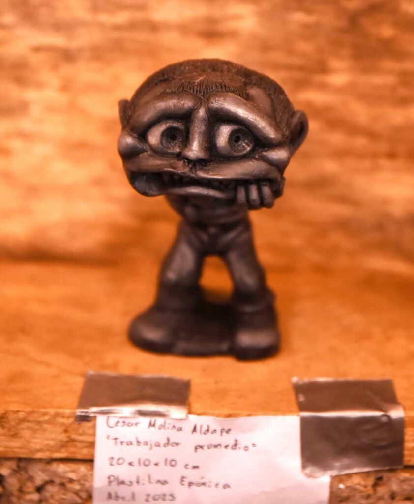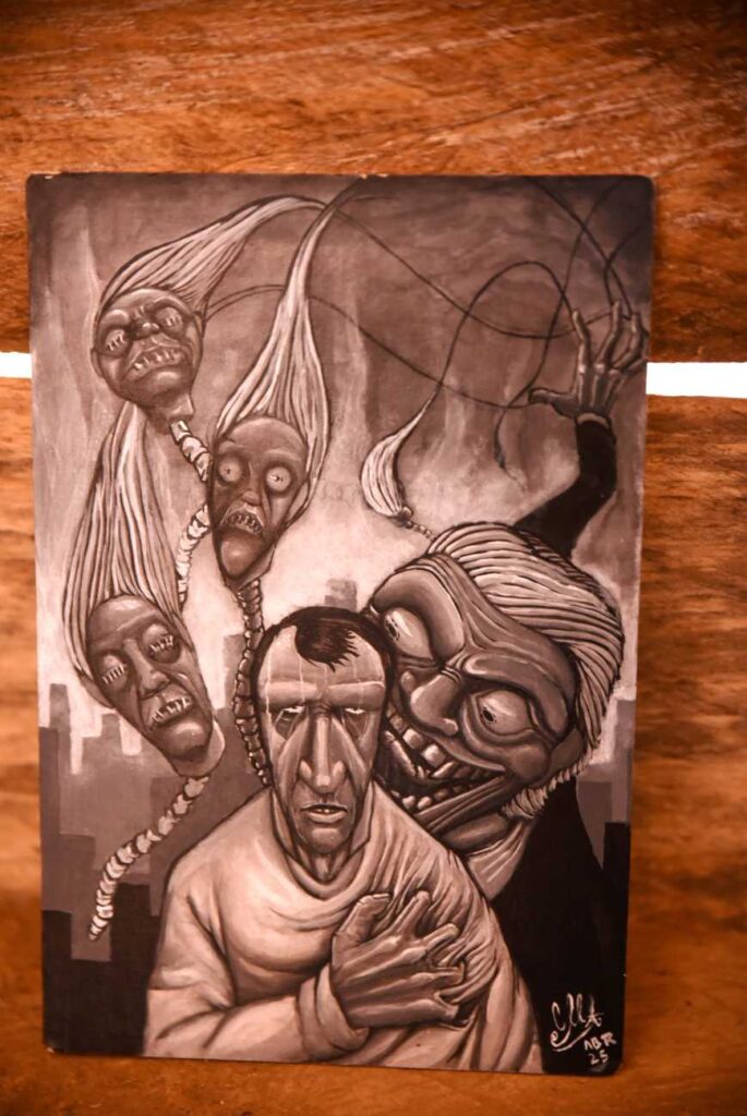 Por su parte, César Molina Aldape, originario de Querétaro, trajo tres obras que reflejan la angustia de la vida urbana, atrapada en un sistema que absorbe identidades y alimenta la marginalidad y la violencia. Como trabajador y artista, Molina encuentra en el zapatismo un horizonte de organización social que contrasta con la individualización de la ciudad. “Las traigo aquí para que se empapen de esperanza”, explicó, destacando cómo el movimiento zapatista le ha inspirado desde sus años universitarios (2011-2015), cuando comenzó a explorar sus comunicados, documentales y visiones del arte como herramienta para imaginar nuevas posibilidades. Para Molina, el arte en este encuentro es un puente hacia una vida donde la participación activa sea posible.