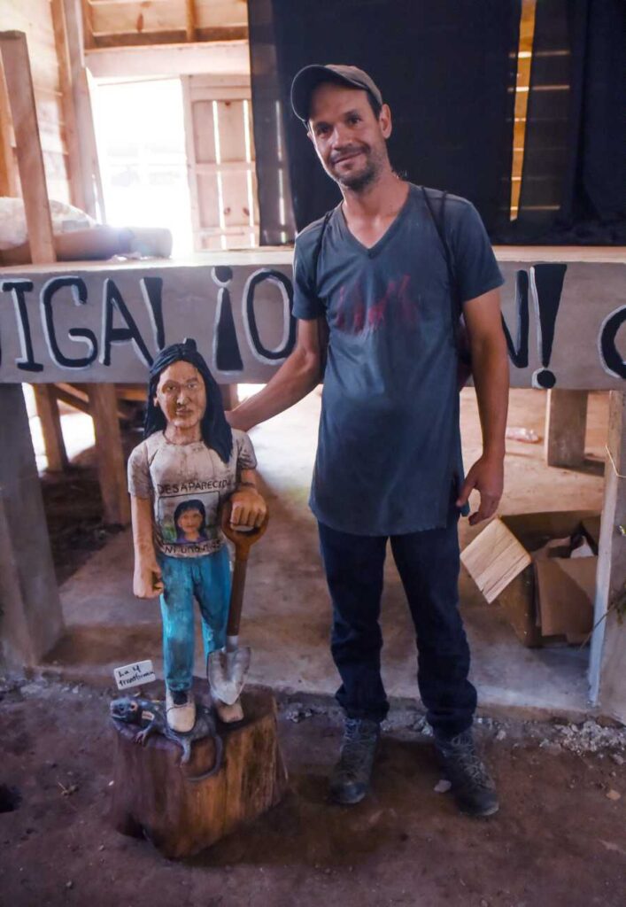 David Arias Dijard, artista con más de 15 años viviendo en Chiapas, presentó su obra Madres Buscadoras, un homenaje a las madres que buscan incansablemente a sus hijos e hijas desaparecidos. La pieza muestra a una mujer monumental pisoteando una rata, símbolo de los partidos políticos y el sistema que perpetúa las desapariciones. “La mujer es grande porque somos mayoría, nosotros mandamos, el gobierno obedece”, afirmó Arias, subrayando la unión entre los movimientos urbanos, los pueblos originarios y el zapatismo contra el “mal gobierno” y el capitalismo. Su mensaje a las madres buscadoras fue claro: “No están solas. Esta obra es mi granito de arena para fortalecer su lucha y despertar a más gente”. Arias ve en el zapatismo una fuerza recíproca que une corazones en la búsqueda de justicia.