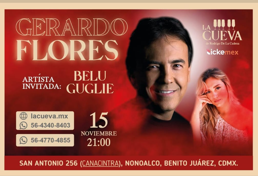 Periodistas Unidos. Ciudad de México. 08 de noviembre de 2024.-lacueva.mx). El próximo viernes 15 de noviembre a las 9 de la noche, La Cueva de Rodrigo de la Cadena abrirá sus puertas para recibir a Gerardo Flores, un destacado cantautor y productor mexicano cuya trayectoria lo ha posicionado como uno de los grandes exponentes de la música romántica y del bolero contemporáneo. Esta presentación especial promete una noche de emotividad y talento, que dejará una profunda huella en los asistentes. Además, la velada contará con la participación de Belu Guglié como artista invitada, agregando un matiz fresco y cautivador a la noche. Para aquellos que desean formar parte de esta noche inolvidable, los boletos están disponibles a través del sistema Tickemex y en el sitio oficial de La Cueva (