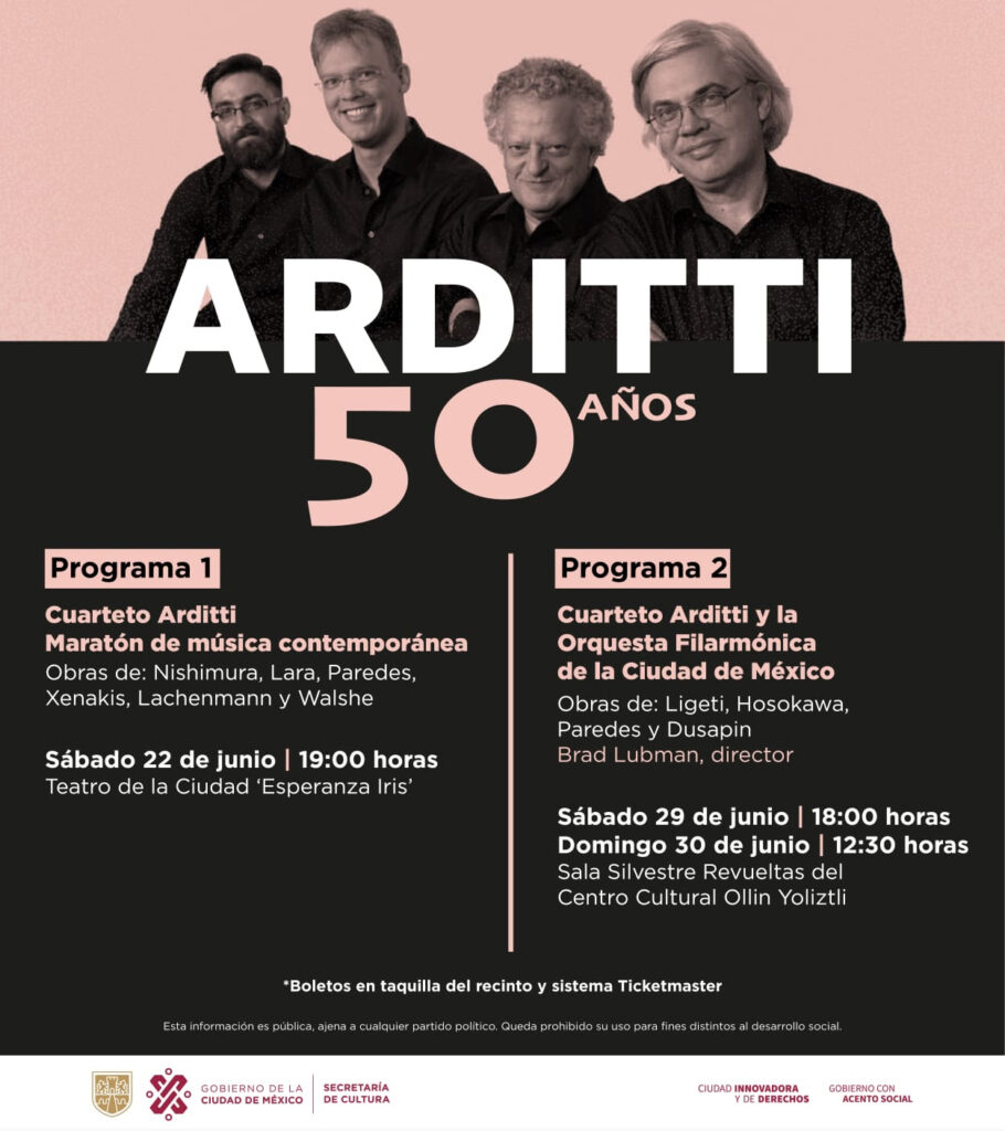 El legendario Cuarteto Arditti se presenta con el concierto “Arditti 50: Maratón de música contemporánea” el sábado 22 de junio a las 19 horas en el Teatro de la Ciudad Esperanza Iris, ubicado en Donceles 36, Centro Histórico, cerca del Metro Allende. Boletos en taquilla del recinto y el sistema Ticketmaster.