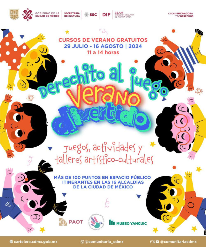 Las actividades de “Derechito al Juego: Verano Divertido” se desarrollan de lunes a viernes de las 11 a las 14 horas en espacios como parques, mercados, deportivos, plazas públicas, sedes del DIF-CDMX, diez puntos itinerantes en las Ferias del Bienestar, el Centro de Especialización de Internamiento Preventivo para Adolescentes y en el Museo Yancuic, uno de los recintos de la Secretaría de Cultura local.