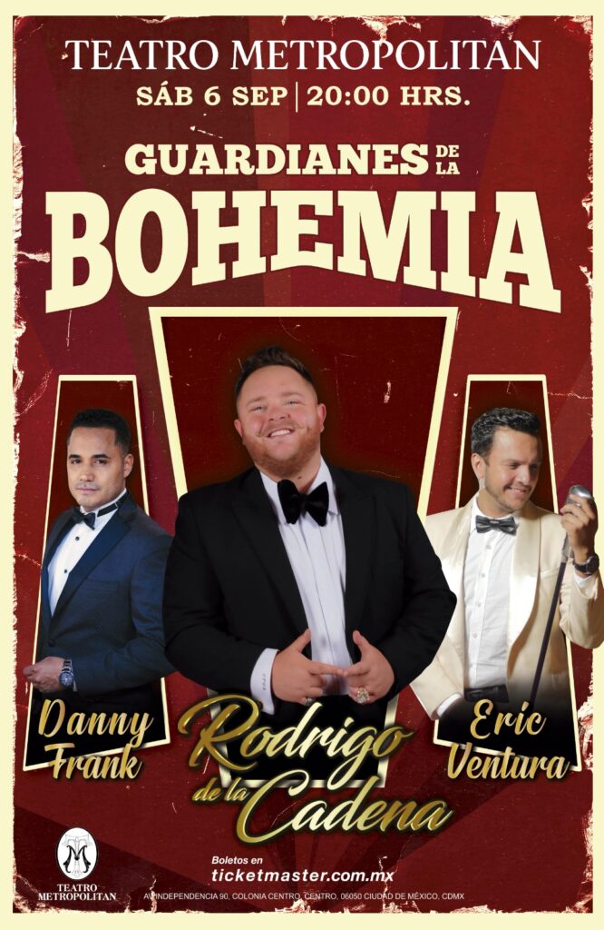 Periodistas Unidos. Ciudad de México. 13 de abril de 2025.- El Teatro Metropolitan, uno de los recintos más emblemáticos de la capital mexicana, se prepara para vivir una noche mágica este sábado 6 de septiembre a las 20:00 horas con el espectáculo «Guardianes de la Bohemia», un concierto que reunirá a tres de las voces más representativas de la música romántica y la trova en México: Danny Frank, Rodrigo de la Cadena y Eric Ventura. Este evento, concebido como un homenaje a la tradición musical bohemia, promete transportar al público a través de las melodías que han marcado generaciones, con arreglos especiales, acompañamiento en vivo y momentos únicos que solo artistas de esta talla pueden ofrecer. Boletos a la venta en el Sistema Ticketmaster y en taquillas del inmueble.