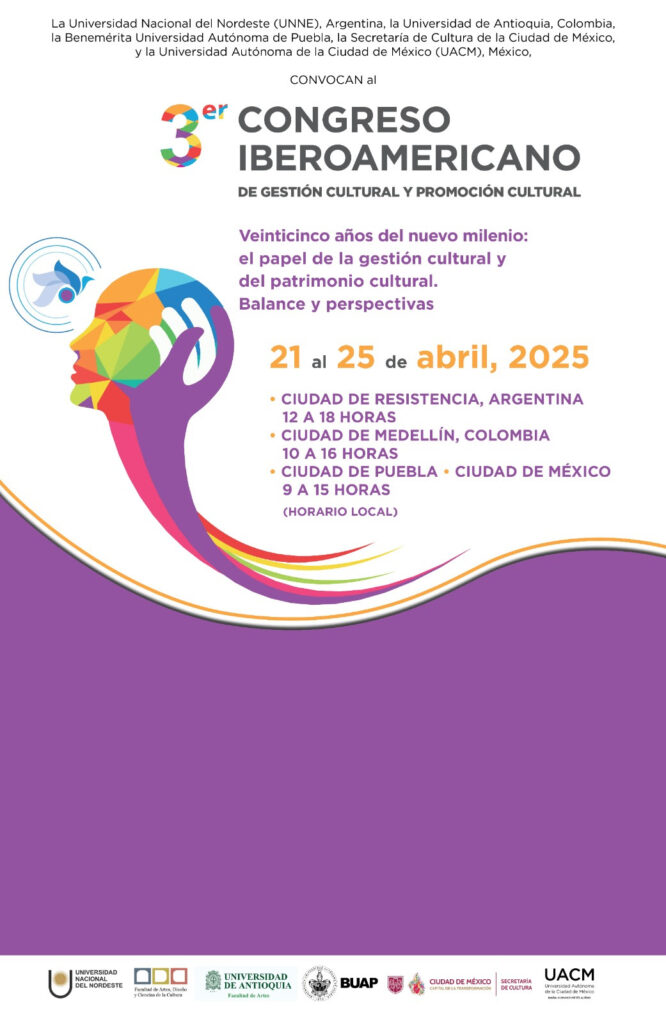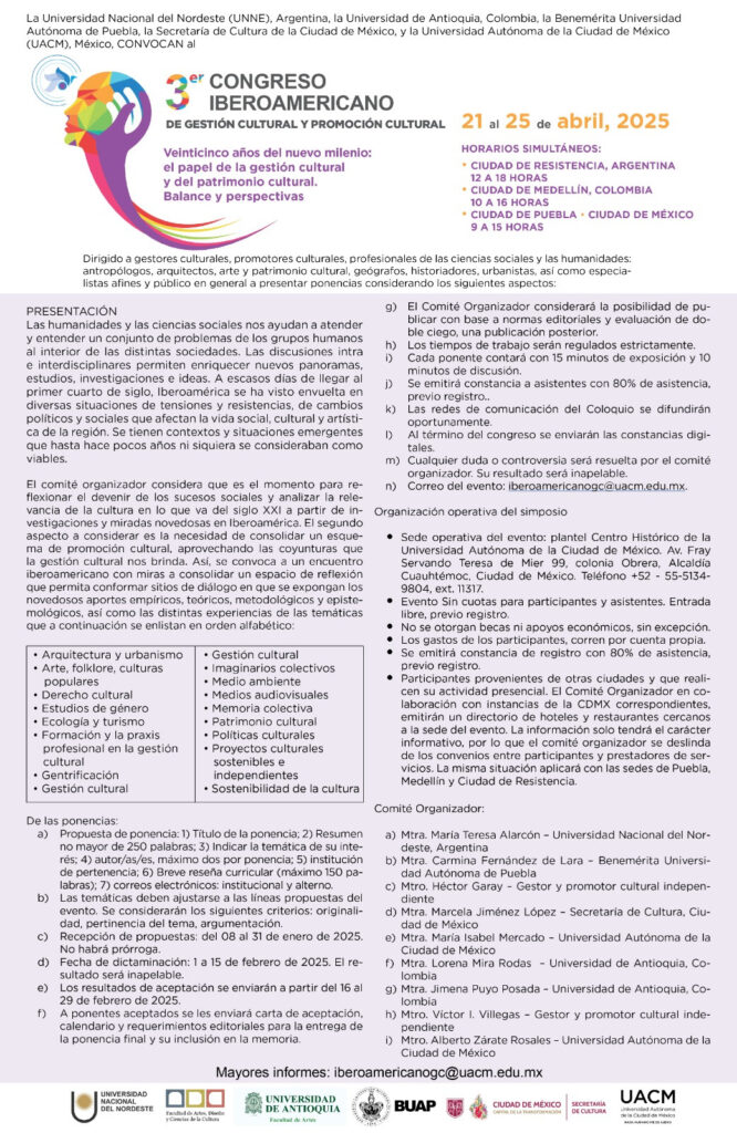 Periodistas Unidos. Ciudad de México. 15 de enero de 2025.- El Gobierno de la Ciudad de México, a través de la Secretaría de Cultura capitalinaTercer Congreso Iberoamericano de Gestión y Promoción Cultural que se realizará de manera simultánea del 21 al 25 de abril 2025 en los tres países., en colaboración con la Universidad Autónoma de la Ciudad de México (UACM), la Benemérita Universidad Autónoma de Puebla, la Universidad Nacional del Nordeste (UNNE) de Argentina y la Universidad de Antioquia de Colombia, convocan a especialistas y público en general a participar en el