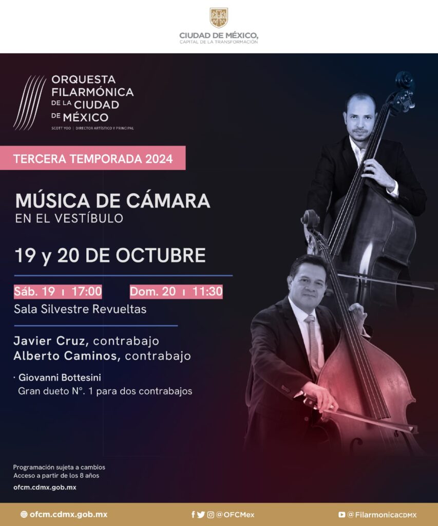 Una hora antes de cada presentación, el sábado a las 17 horas, y el domingo a las 11:30 horas, en el vestíbulo de la sala los integrantes de la OFCM ofrecerán Música de Cámara con la interpretación de Gran Duetto No.1 de Giovanni Bottesini, en la que participarán los maestros Javier Cruz y Alberto Caminos, contrabajos.
