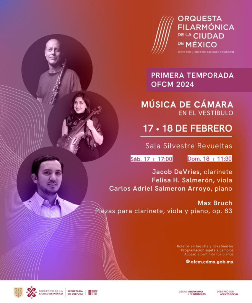 Como parte del programa “Música de Cámara”, el sábado 17 de febrero a las 17 horas y el domingo 18 de febrero a las 11:30 horas, los maestros integrantes de la orquesta Jacob DeVries, clarinete, Felisa H. Salmerón, viola, y el pianista invitado Carlos Adriel Salmerón interpretan Ocho Piezas para clarinete, viola, y piano de Max Bruch en el lobby de la Sala Silvestre Revueltas