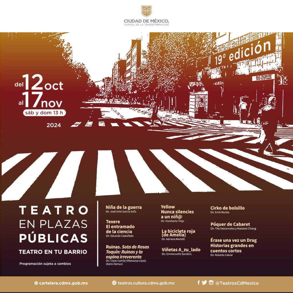Del 12 de octubre al 17 de noviembre, la iniciativa escénica presentará 90 funciones de 9 espectáculos gratuitos en diversos espacios públicos como las Utopías de Iztapalapa, además del Museo del Telégrafo y la Biblioteca Vasconcelos