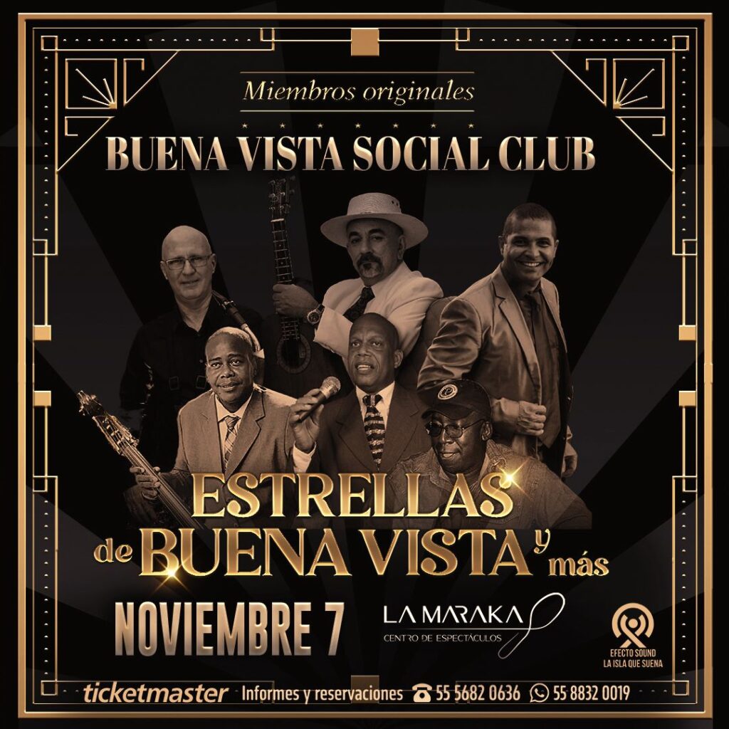 Las Estrellas de Buenavista Social Club se presentan el próximo Jueves 7 de noviembre de 2024 en el Centro de Espectáculos La Maraka a partir de las nueve de la noche. Boletos a la venta en el Sistema Ticketmaster y en taquillas del inmueble.