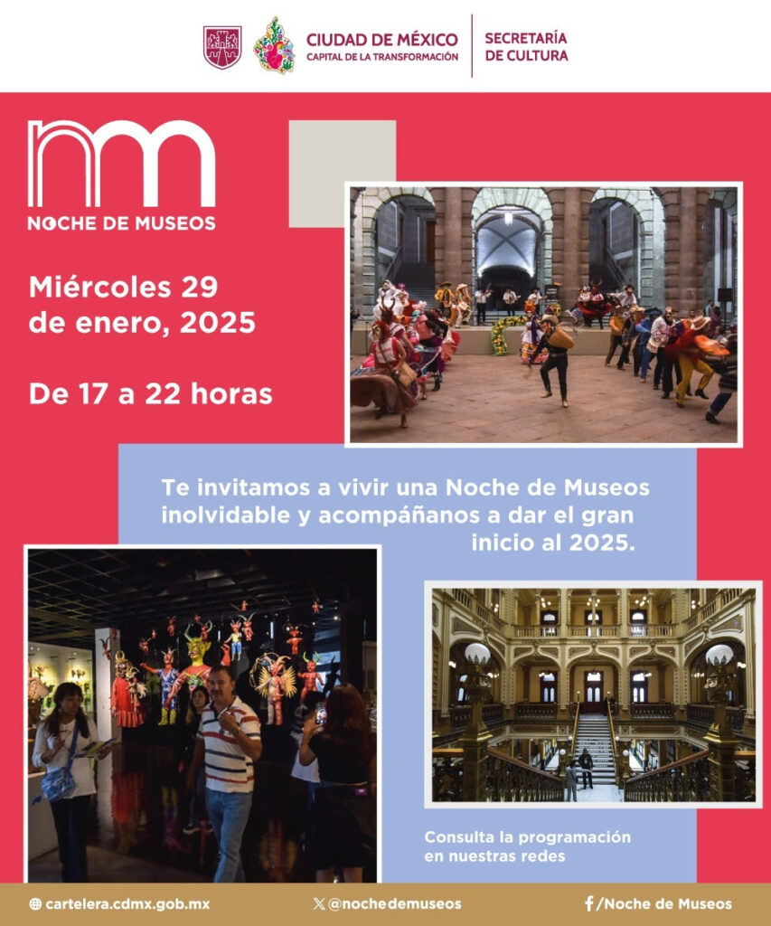 Periodistas Unidos. Ciudad de México. 28 de enero de 2025.- La iniciativa de la Secretaría de Cultura de la Ciudad de México, “Noche de Museos”miércoles 29 de enero, en la que cerca de 70 espacios culturales de toda la capital prepararon visitas guiadas, talleres, conciertos, presentaciones de danza, proyecciones y muchas actividades más., en la que el último miércoles de cada mes decenas de recintos extienden sus horarios y ofrecen actividades especiales, inicia este 2025 con su primera edición que se realizará este
