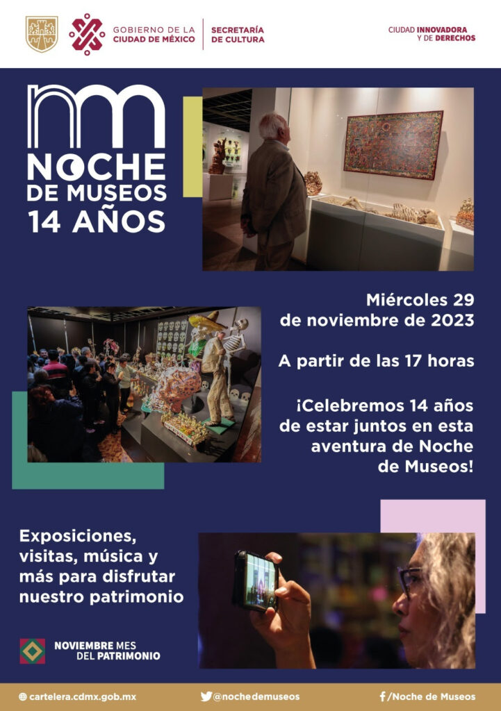 El 29 de noviembre se celebran 14 años de la Noche de Museos, iniciativa de la Secretaría de Cultura de la Ciudad de México que el último miércoles de cada mes ofrece en diversos recintos culturales de la capital actividades como talleres, conciertos, conversatorios y visitas guiadas, en un horario ampliado hasta las 22:00 horas