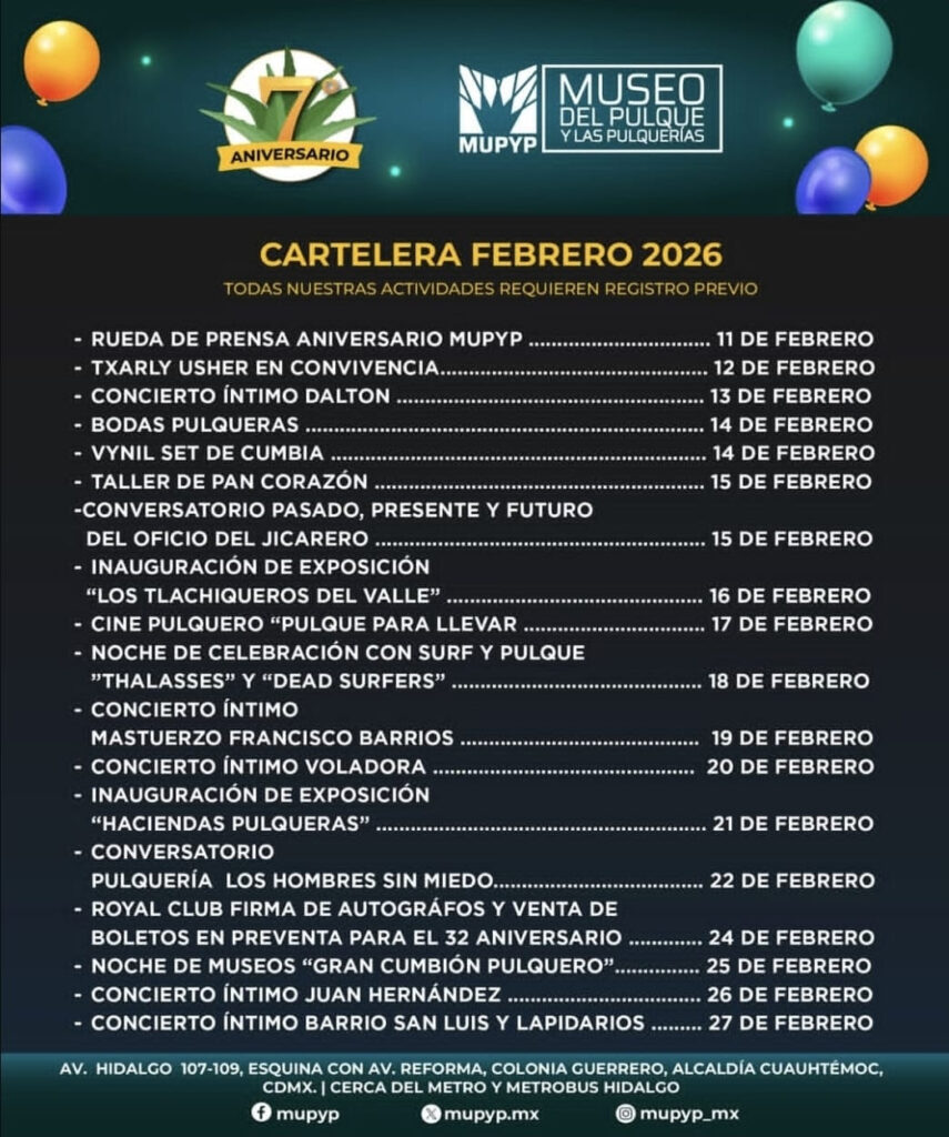 Periodistas Unidos. Ciudad de México. 14 de febrero de 2026.- El Museo del Pulque y las Pulquerías (MUPYP) cumple siete años de labor ininterrumpida en la dignificación del maguey y la cultura popular. Para festejarlo, el recinto anunció una robusta cartelera que abarca todo el mes de febrero, incluyendo conciertos de bandas icónicas como Juan Hernández y su Banda de Blues y El Mastuerzo, además de conversatorios, exposiciones fotográficas y las ya tradicionales Bodas Pulqueras.