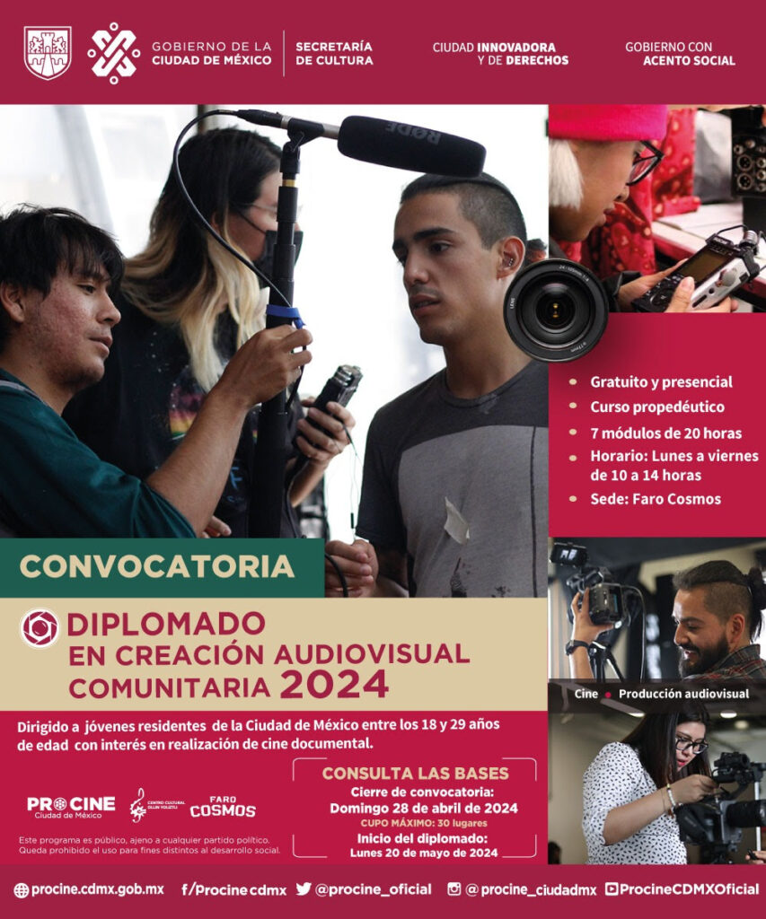 Periodistas Unidos. Ciudad de México. 18 de abril de 2024.- La Secretaría de Cultura de la Ciudad de México, a través del Fideicomiso para la Promoción y Desarrollo del Cine Mexicano en la Ciudad de México (PROCINECDMX), en colaboración con el Centro Cultural Ollin Yoliztli, convoca a jóvenes residentes de la capital que tengan entre 18 y 29 años de edad, con interés en el cine documental, a participar en la convocatoria para cursar el “Diplomado en Creación Audiovisual Comunitaria”.