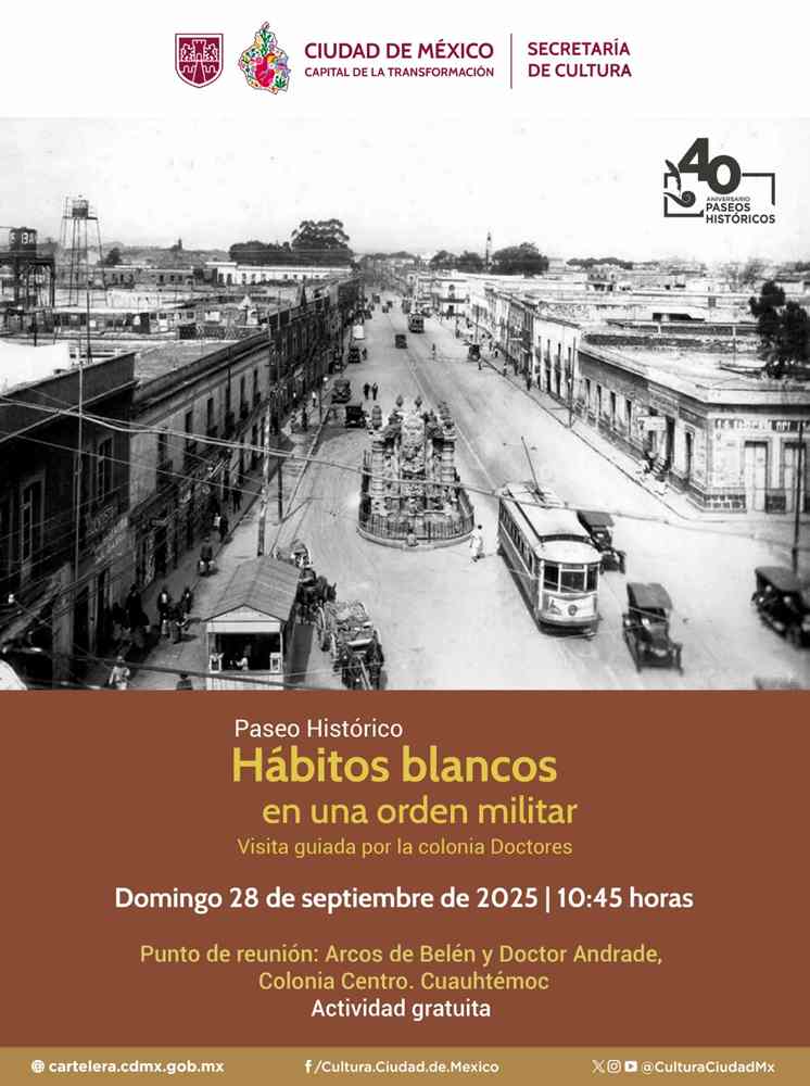 Periodistas Unidos. Ciudad de México. 26 de septiembre de 2025.- La Secretaría de Cultura de la Ciudad de México, a través del programa Paseos Históricos de la Dirección General de Patrimonio Histórico, Artístico y Cultural, invita al recorrido guiado gratuito “Hábitos blancos en una orden militar” este domingo 28 de septiembre, a las 10:45 horas, en la Colonia Doctores, Cuauhtémoc. Los asistentes descubrirán las historias del Templo de Belén de Mercedarios, conocido como “Merceditas”, la fuente y el acueducto de Salto del Agua, y la Parroquia Nuestra Señora de los Dolores del Campo Florido.