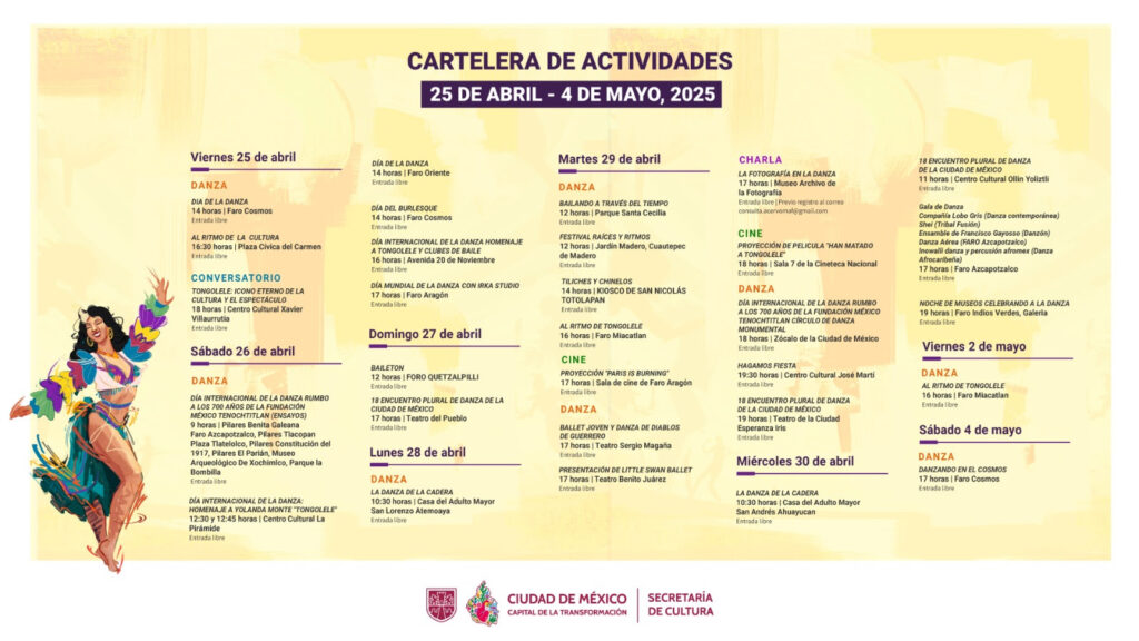 El sábado 26 de abril, a partir de las 12:00 horas, el Centro Cultural La Pirámide ofrecerá demostraciones de un grupo de salsa en línea y danza afrobrasileña en homenaje a Tongolele. FARO Cosmos celebrará el Día del Burlesque a las 14 horas; a las 17 horas, FARO Aragón será sede de la presentación de Irka Studio exhibiendo géneros como salsa, heels, baby ballet, danza contemporánea y urbano.