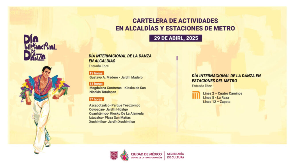 Periodistas Unidos. Ciudad de México. 25 de abril de 2025.- Para celebrar el Día Internacional de la Danza, que cada año se conmemora el 29 de abril, la Secretaría de Cultura de la Ciudad de México preparó una jornada con más de 218 presentaciones en 32 recintos y sedes, que incluyen bailes comunitarios, exhibiciones de diferentes estilos, homenajes a Tongolele y la cultura sonidera, proyecciones de películas, conversatorios, clases magistrales y muestras de talleres, con la participación de más de 5 mil bailarinas y bailarines, del 25 de abril al 4 de mayo.