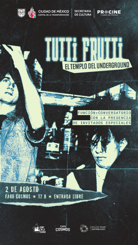 Periodistas Unidos. Ciudad de México. 01 de agosto de 2025.- El documental Tutti Frutti. El templo underground que celebra la escena contracultural del rock a mediados de la década de los 80 en la Ciudad de México revivirá el espíritu de aquellos años a través de la proyección de entrada libre que ofrecerá la Fábrica de Artes y Oficios (FARO) Cosmos, recinto perteneciente a la Secretaría de Cultura de la Ciudad de México, en colaboración con el Fideicomiso para la Promoción y Desarrollo del Cine Mexicano (PROCINECDMX), para el sábado 2 de agosto, a las 17 horas, y al finalizar, estará acompañado por un conversatorio con músicos e invitados especiales.