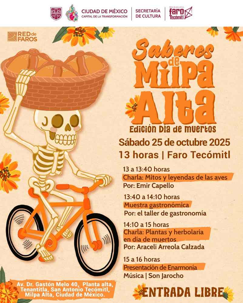 Periodistas Unidos. Ciudad de México. 23 de octubre de 2025.– La Fábrica de Artes y Oficios (FARO) Tecómitl, recinto de la Secretaría de Cultura de la Ciudad de México, invita a la edición especial por el Día de Muertos de “Saberes de Milpa Alta”, un evento gratuito que se llevará a cabo el sábado 25 de octubre a partir de las 13:00 horas. Esta jornada busca honrar la cosmovisión y el respeto por la vida y la muerteMilpa Alta, fortaleciendo la identidad cultural y la conexión intergeneracional a través de saberes ancestrales. de los pueblos originarios de