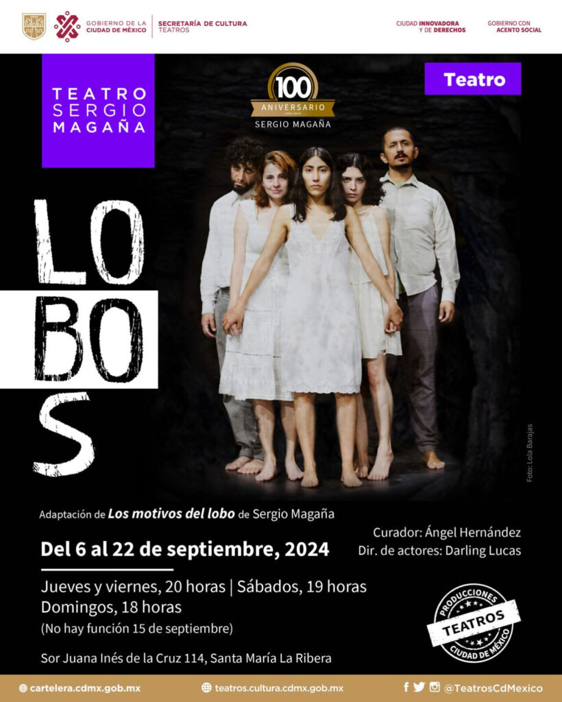 Lobos se escenificará del 6 al 22 de septiembre, los jueves y viernes a las 20 horas, los sábados a las 19 horas y los domingos a las 18 horas –excepto el domingo 15 de septiembre–, en el Teatro Sergio Magaña, ubicado en Sor Juana Inés de la Cruz 114, colonia Santa María la Ribera, cerca del Metro San Cosme.