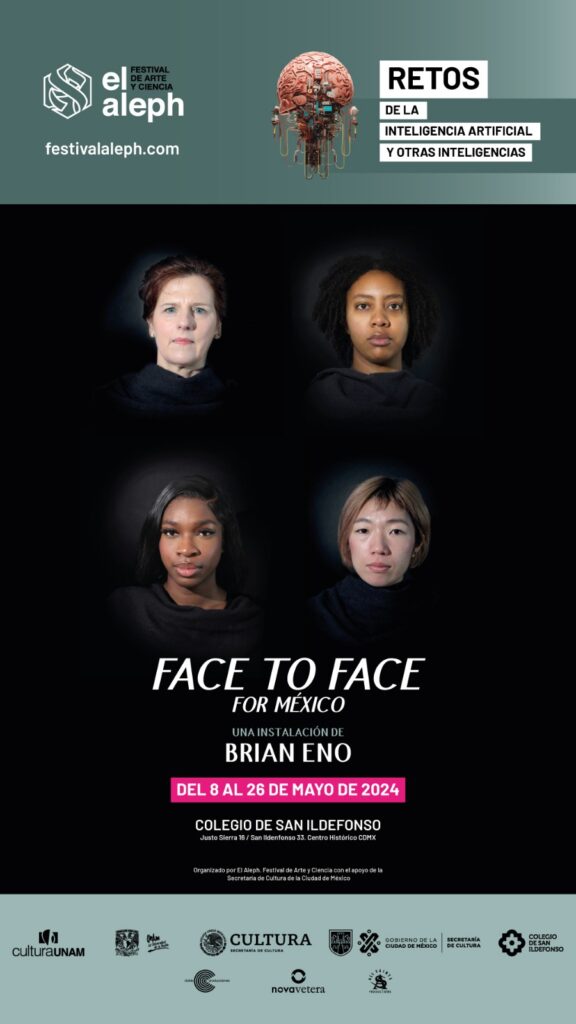 Periodistas Unidos. Ciudad de México. 24 de abril de 2024.- La Secretaría de Cultura de la Ciudad de México participará en la octava edición del Festival El Aleph de la Universidad Nacional Autónoma de México (UNAM), que se lleva a cabo del 8 al 19 de mayo en diversas sedes universitarias, con la exposición multidisciplinaria Face to Face del músico y artista visual Brian Eno, que se instalará en la Capilla del Antiguo Colegio de San Ildefonso en el Centro Histórico capitalino.