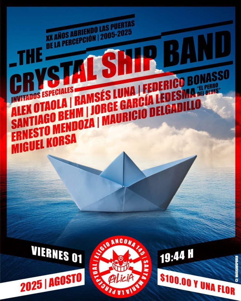 Periodistas Unidos.  Ciudad de México. 24 de julio de 2025.- The Crystal Ship Band celebrará con un concierto muy especial dos décadas interpretando la música de la icónica banda The Doors, acompañados en el escenario por grandes figuras del rock nacional como: Alex Otaola (Cuca y Santa Sabina), Ramsés Luna (Luz de Riada y Cabezas de Cera), Santiago Behm (El juguete rabioso) y muchos más. La cita es el viernes 1 de agosto en el legendario Multiforo Alicia, en la Ciudad de México. Los boletos podrán adquirirse en las taquillas del lugar el día del evento.