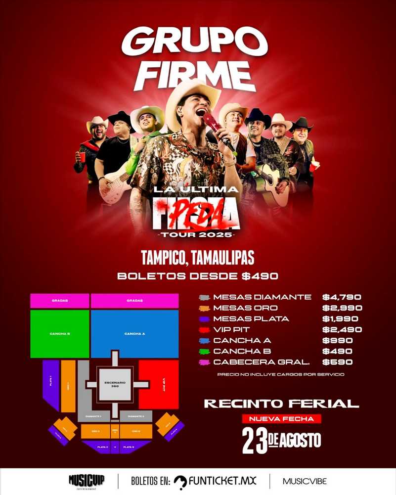 Periodistas Unidos. Ciudad de México. 17 de agosto de 2025.- En el horizonte musical de Tampico se avecina una noche destinada a quedar grabada en la memoria colectiva. El próximo Sábado 23 de agosto, el Recinto Ferial del puerto jaibo se transformará en el epicentro de una celebración que promete romper moldes: Grupo Firme desplegará un espectáculo en formato 360 gradosregional mexicano en Tamaulipas. Los boletos se encuentran disponibles en el sistema FunTicket en https://funticket.mx/, con precios que van desde los 490 hasta los 4,900 pesos., envolviendo a su público en una experiencia donde cada ángulo será privilegiado y cada mirada encontrará el reflejo de un momento irrepetible. No será un concierto más; será una comunión de voces, luces y emociones que convertirá la fecha en un hito para la historia del
