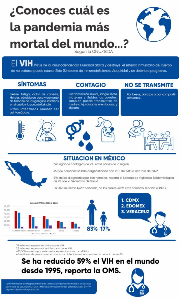 La subdirectora médica del Hospital D’María menciona que en lo que va del año se han diagnosticado en México 13,489 casos nuevos, mientras en Veracruz suman 1.290. Al contabilizar 33,910 casos notificados de 1983 a octubre de 2023, Veracruz se ubica en el tercer estado del país con más casos.