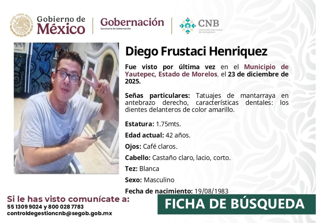 Periodistas Unidos. Ciudad de México. 08 de enero de 2026.- Andrea, padre de Diego Fustaci Henríquez, un joven de 42 años desaparecido desde el 23 de diciembre de 2025 en Cocoyoc, Morelos, ha hecho un llamado urgente a la Fiscalía General del Estado de Morelos para que revele más videos de vigilancia que podrían ayudar a esclarecer el paradero de su hijo. Asimismo, insta a la Fiscalía General de la República (FGR) a intensificar la búsqueda a nivel nacional, argumentando que el tiempo transcurrido sin avances genera una angustia insoportable para su familia.