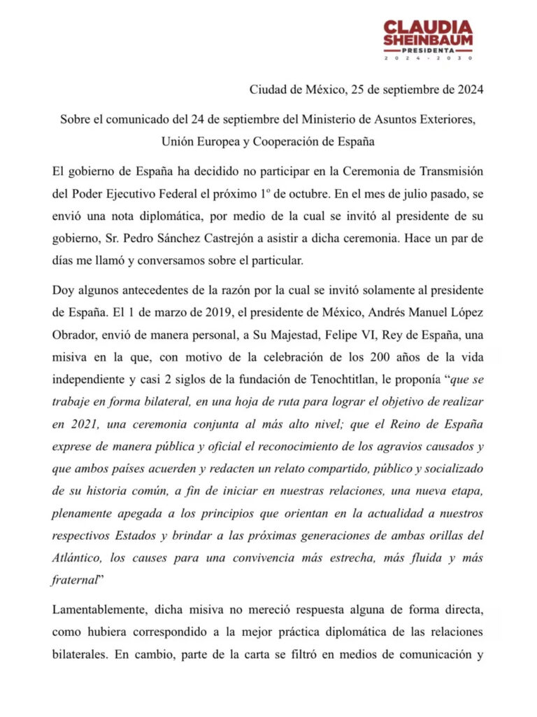 Cuestionada por si México va a romper relaciones diplomáticas con España, Sheinbaum ha contestado con un contundente: “No, ¿Cómo creen? Pero necesitamos respeto, eso es todo”, según recoge la prensa mexicana. Estas palabras de la presidenta electa se dan después de que esta tarde publicara un comunicado en redes sociales donde explicaba su decisión de no invitar a Felipe VI a la investidura.