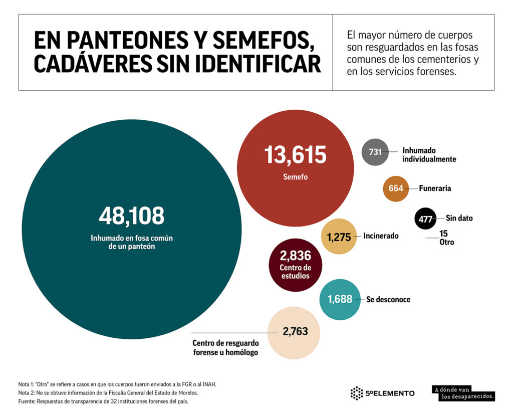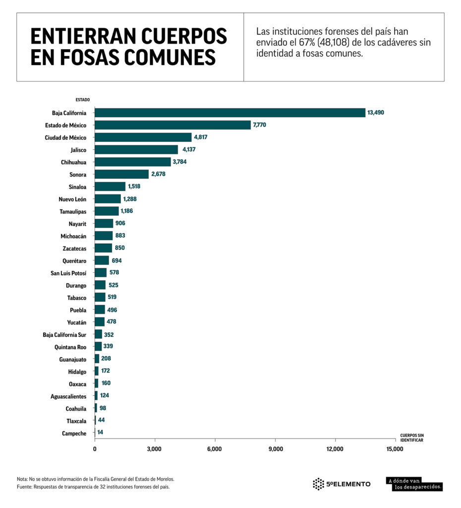 Los Semefos de algunas entidades envían a la fosa común casi la totalidad de los cuerpos que reciben. En Yucatán enterraron 479 de los 492 cadáveres que llegaron a sus morgues, el 97%, el mismo porcentaje que en Baja California, donde se inhumaron 13,490 de 13,940 víctimas anónimas. En Nuevo León y el Estado de México, se enterró el 95%.