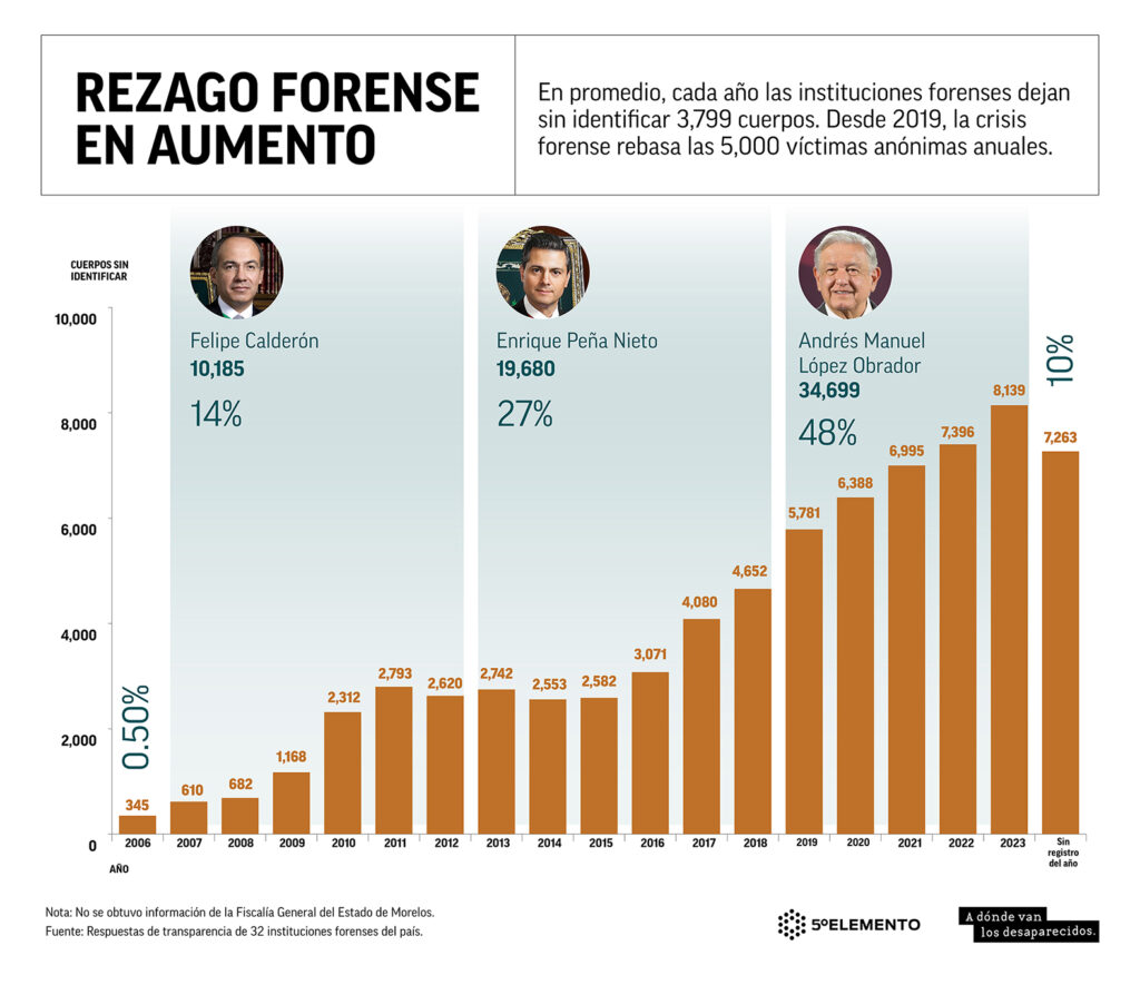 De 2019 a 2023, durante el gobierno de López Obrador, ingresaron a las morgues 34,699 cuerpos que permanecen sin identidad. Aunque el presidente prometió atender de manera prioritaria la crisis forense y las desapariciones de personas —que en este sexenio suman 51,791 víctimas—, las iniciativas para enfrentarlas: el Mecanismo Extraordinario de Identificación Forense, el Centro Nacional de Identificación Humana y el Banco Nacional de Datos Forenses, fueron desmanteladas o no se concretaron