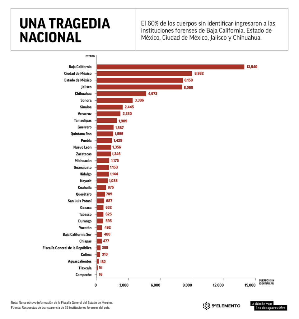 La mayoría de los cadáveres se concentran en cinco entidades: Baja California, Estado de México, Ciudad de México, Jalisco y Chihuahua, de donde provienen 6 de cada 10 cuerpos, 43,813 en total. Baja California ocupa el primer lugar; hasta diciembre de 2023 había 13,940 personas fallecidas en espera de ser sacadas del anonimato por peritos forenses.
