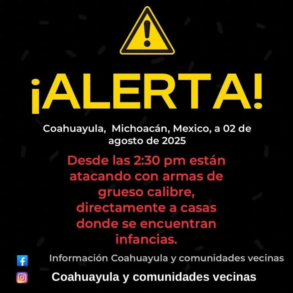 Un post en Instagram de la cuenta @coahuayulaycomunidadesvecinas, publicado el 19 de octubre de 2025, alertó sobre un ataque. La amenaza se extendió por más de 48 horas, con disparos y explosivos dirigidos contra la población. No hubo distingo entre hombres, mujeres o infantes. «Las comunidades permanecen bajo asedio, sin presencia de autoridades que contengan la violencia», se lee en el mensaje, que hace un llamado a la solidaridad y a compartir información para generar «ruido mediático». Al día siguiente, el 21 de octubre, la Red TDT emitió la Acción Urgente 008, documentando el patrón de violencia y exigiendo intervención inmediata del gobierno de Michoacán, la Secretaría de Seguridad y Protección Ciudadana (SSPC), la Fiscalía General de la República (FGR) y organismos internacionales como la Oficina del Alto Comisionado de las Naciones Unidas para los Derechos Humanos (OACNUDH-México) y la Comisión Interamericana de Derechos Humanos (CIDH).